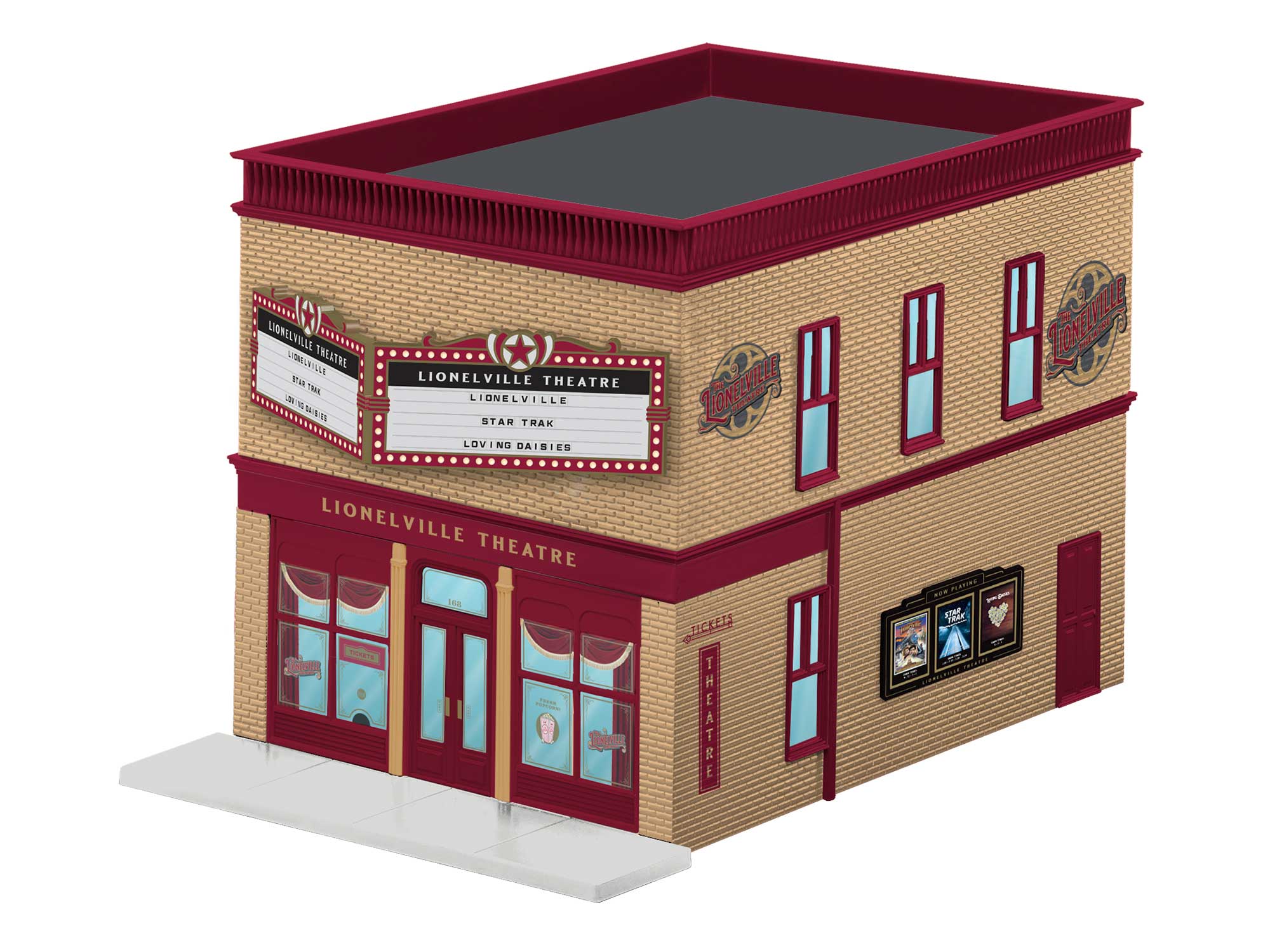 Add some classic realism to your layout with this Lionel Theatre! * Plug-Expand-Play * LED Illuminated Interior and Blinking Marquee * Lighted Poster Boards on each side *Detailed Interior * Dimensions:ÊDimensions: 9 1/4"L x 6"W x 6"H *