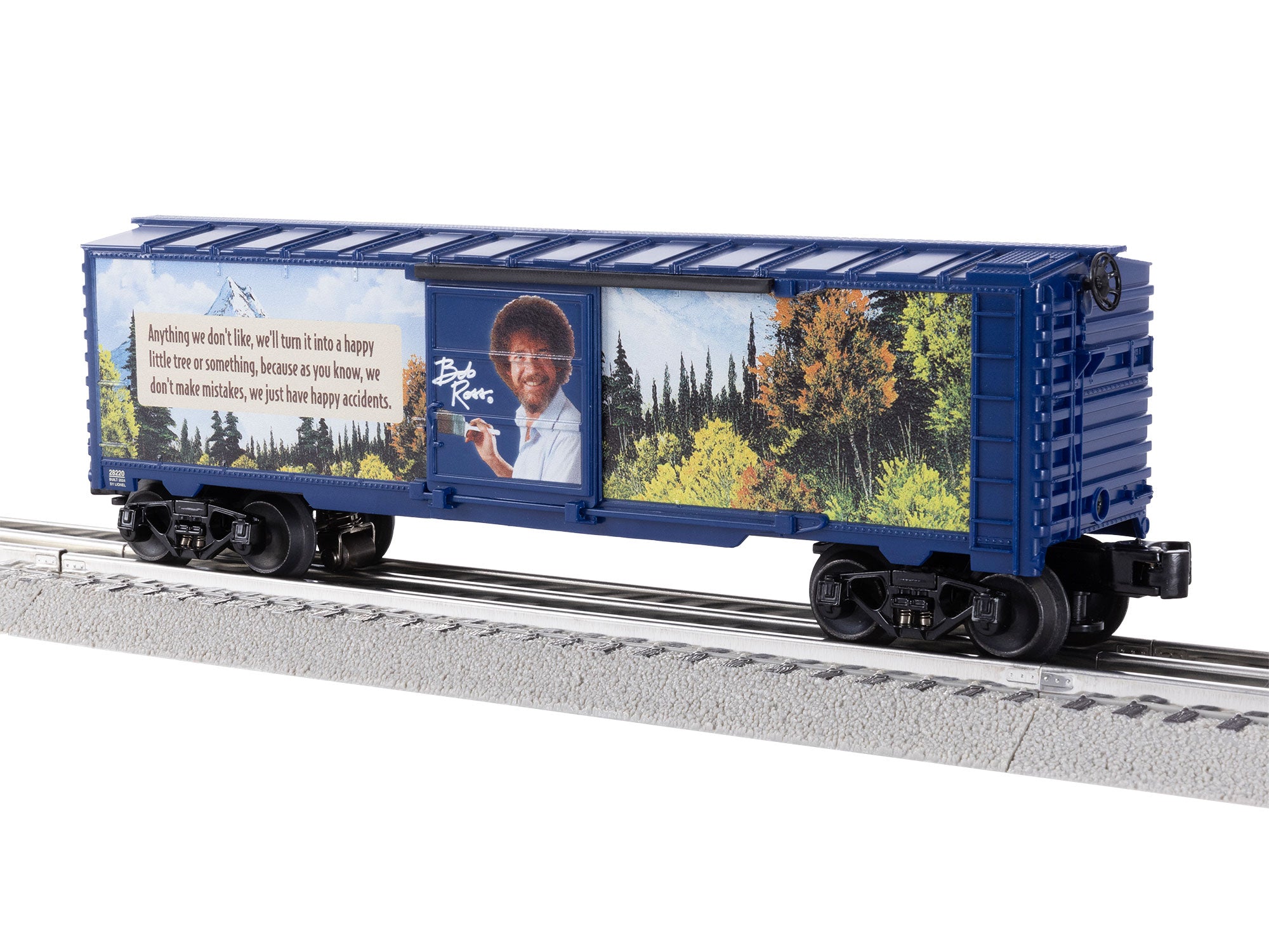 O guage box car * * *Die-cast trucks *Operating couplers *Inspiring Bob Ross sound quotes on a timed loop *Dimensions: Length: 10 1/2"