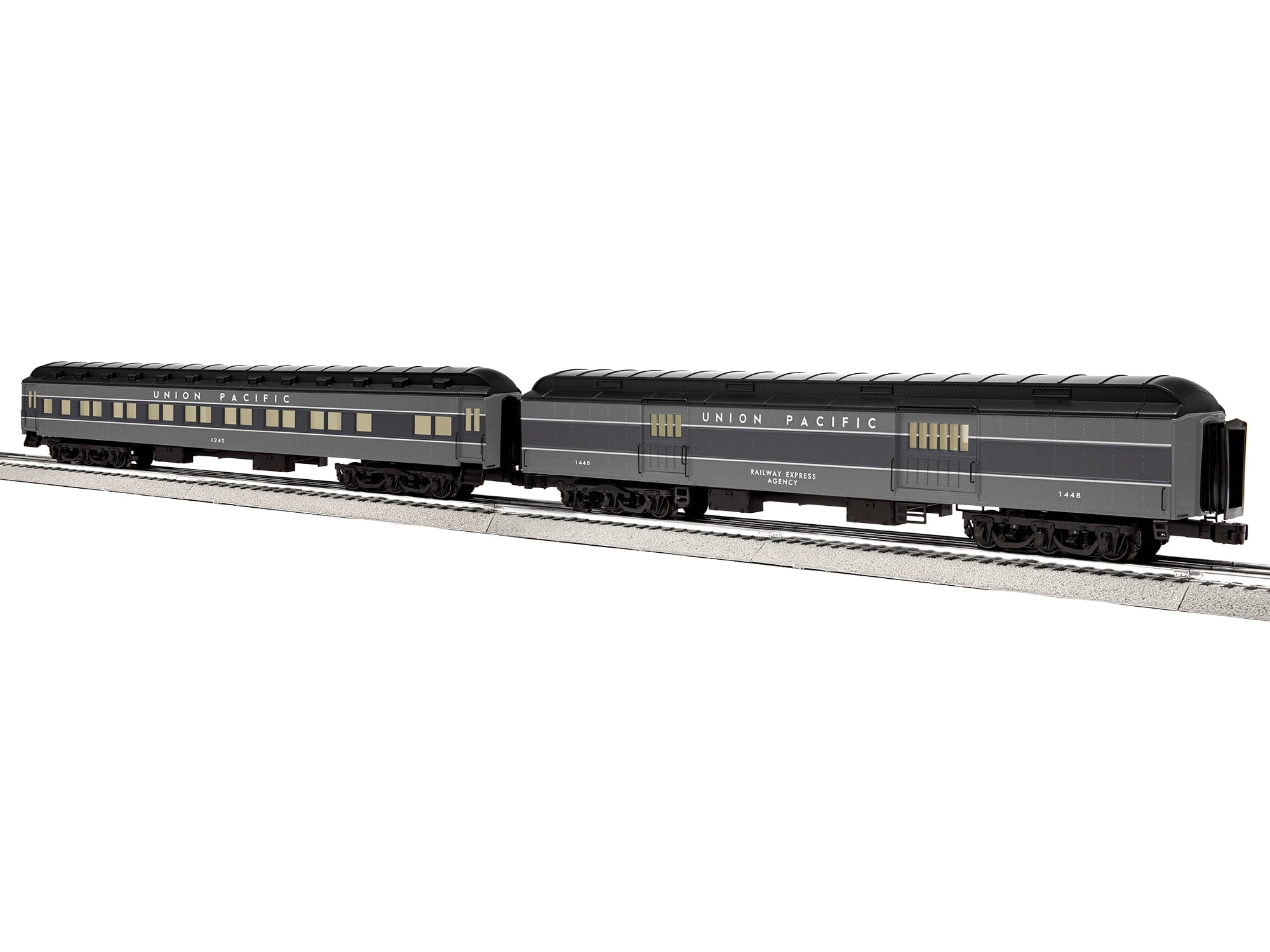 En 1946, l'Union Pacific adopta une livrée grise bicolore similaire à celle de Pullman. Durant la transition de la vapeur au diesel, les compositions mixtes vert olive foncé, gris bicolore et jaune étaient aussi courantes qu'une motorisation mixte en tête de ces trains. * En général, les teintes grises étaient appliquées à tout le matériel roulant voyageurs des trains de nuit secondaires jusqu'en 1952, date à laquelle une livrée jaune-gris uniforme fut adoptée. * Éclairage intérieur LED sans scintillement * Bogies à six roues à suspension moulés sous pression * Attelages fonctionnels avec languettes de dételage dissimulées * Diaphragmes flexibles entre les voitures * Portes ouvrantes * Intérieurs détaillés avec figurines * Dimensions : Longueur : 48 cm (19 pouces)