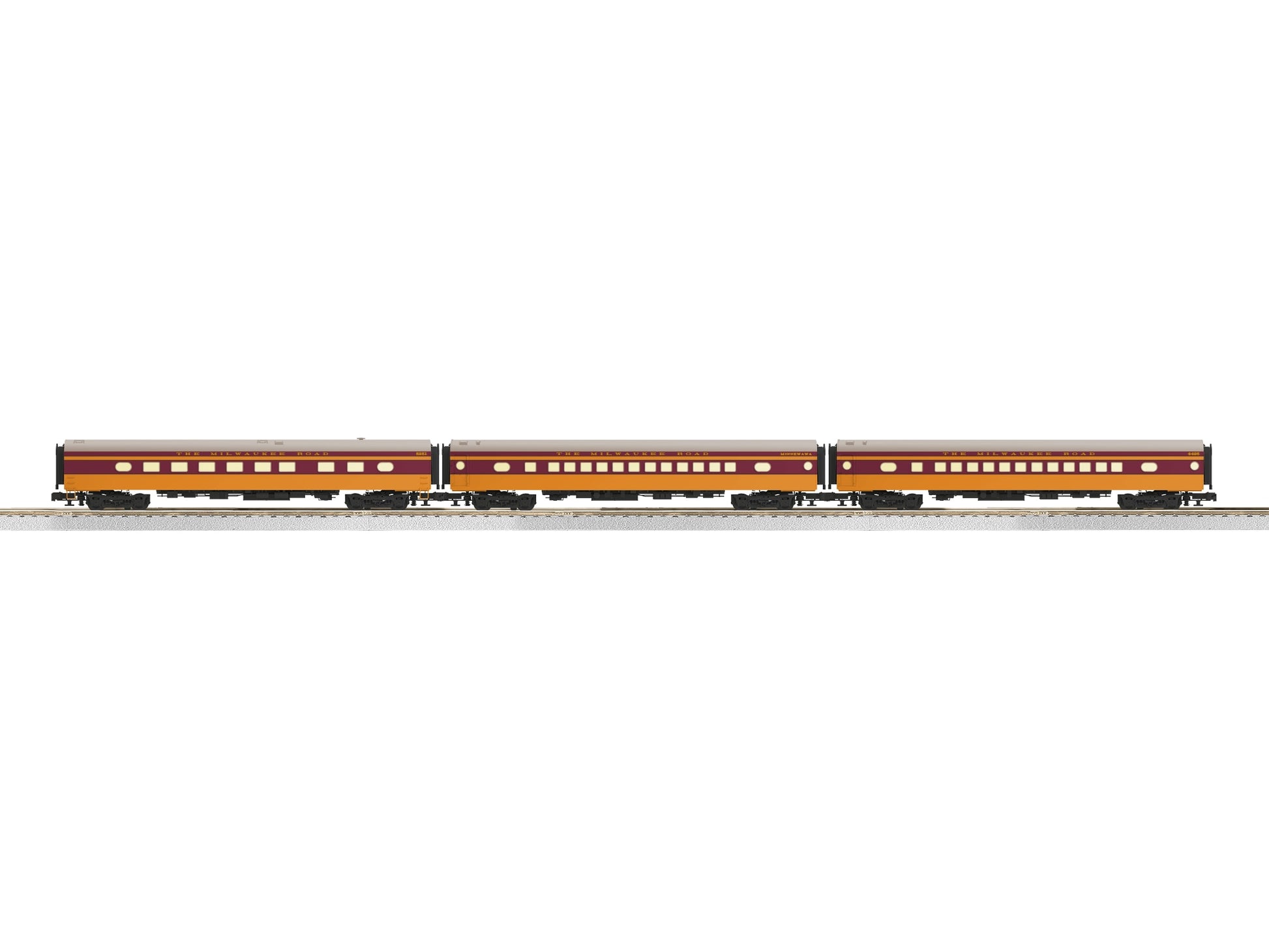 To accompany the return of our LEGACY Milwaukee Road Class A Atlantics, we're bringing back matching 18" aluminum-bodied passenger cars. These cars, with different details than those last offered in 2006 to better reflect the 1935-42 versions of the Hiawatha, feature aluminum bodies, die-cast trucks, and detailed LED-illuminated interiors with figures. * * *Aluminum body construction *Die-cast sprung trucks *Operating couplers with hidden tabs *Opening doors *Flicker-free LED interior lighting *Complete interiors with figures *Separately applied detail parts *Dimensions: Length: 19" each