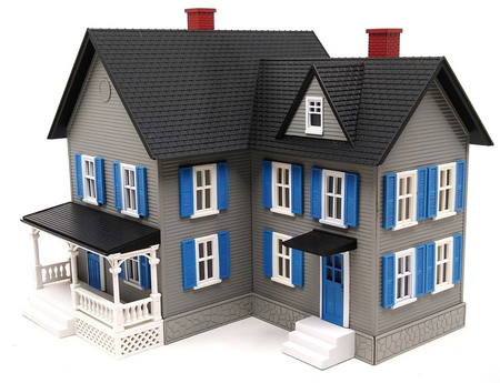 MTH #6 FARM HOUSE - GRAY WITH BLUE SHUTTERS